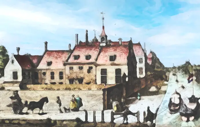 Op de hoek van de Muzenstraat nummer 1 en de Fluwelen Burgwal stond meer dan 150 jaar lang het door keizer Napoleon gestichte Militair Hospitaal.